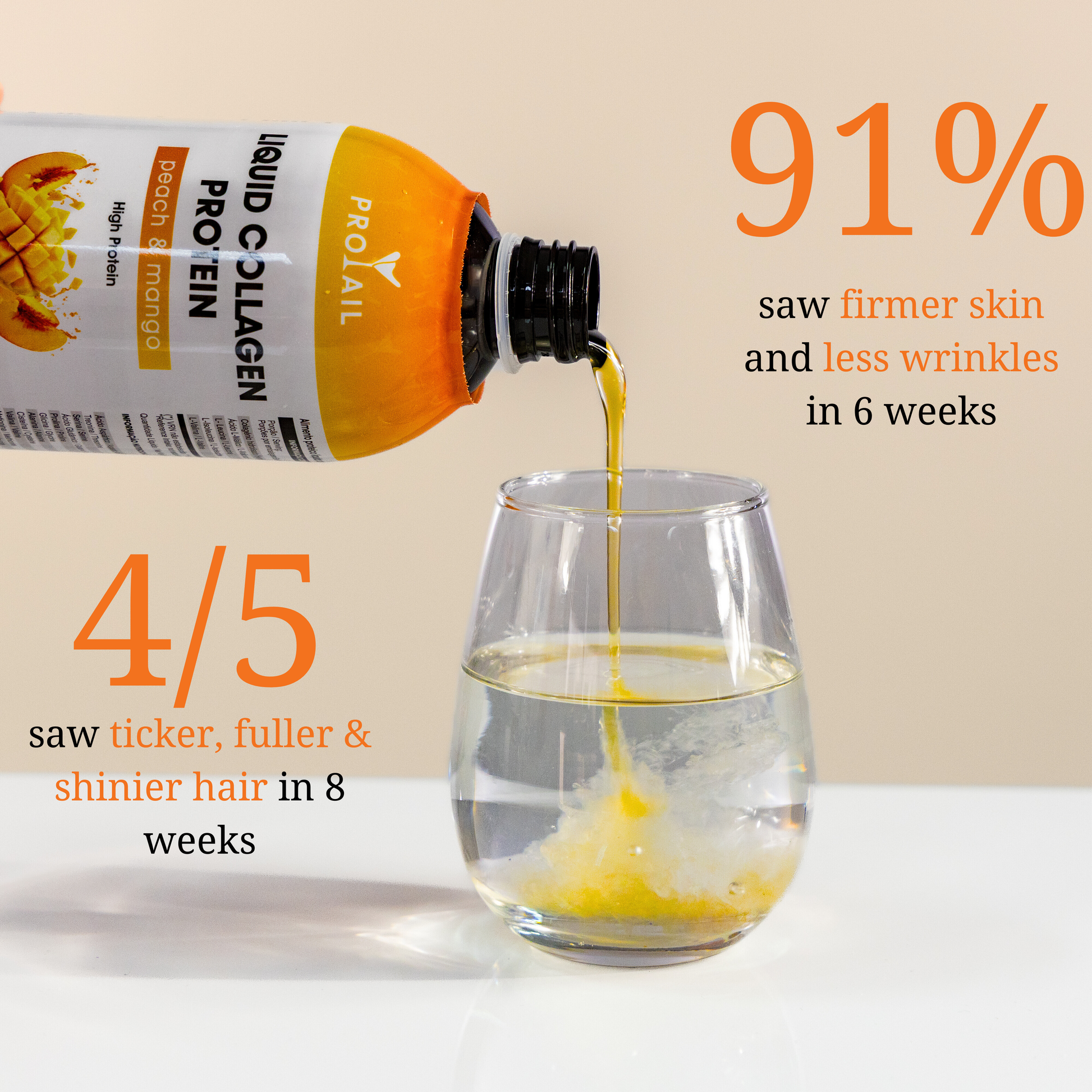 Cada encomenda da PROTAIL inclui um frasco de 500 ml de colagénio líquido — suficiente para 10 a 33 porções, dependendo da sua dose diária. Também incluímos um copo medidor de 50 ml gratuito para que possa medir 15 a 50 ml sem ter de adivinhar.